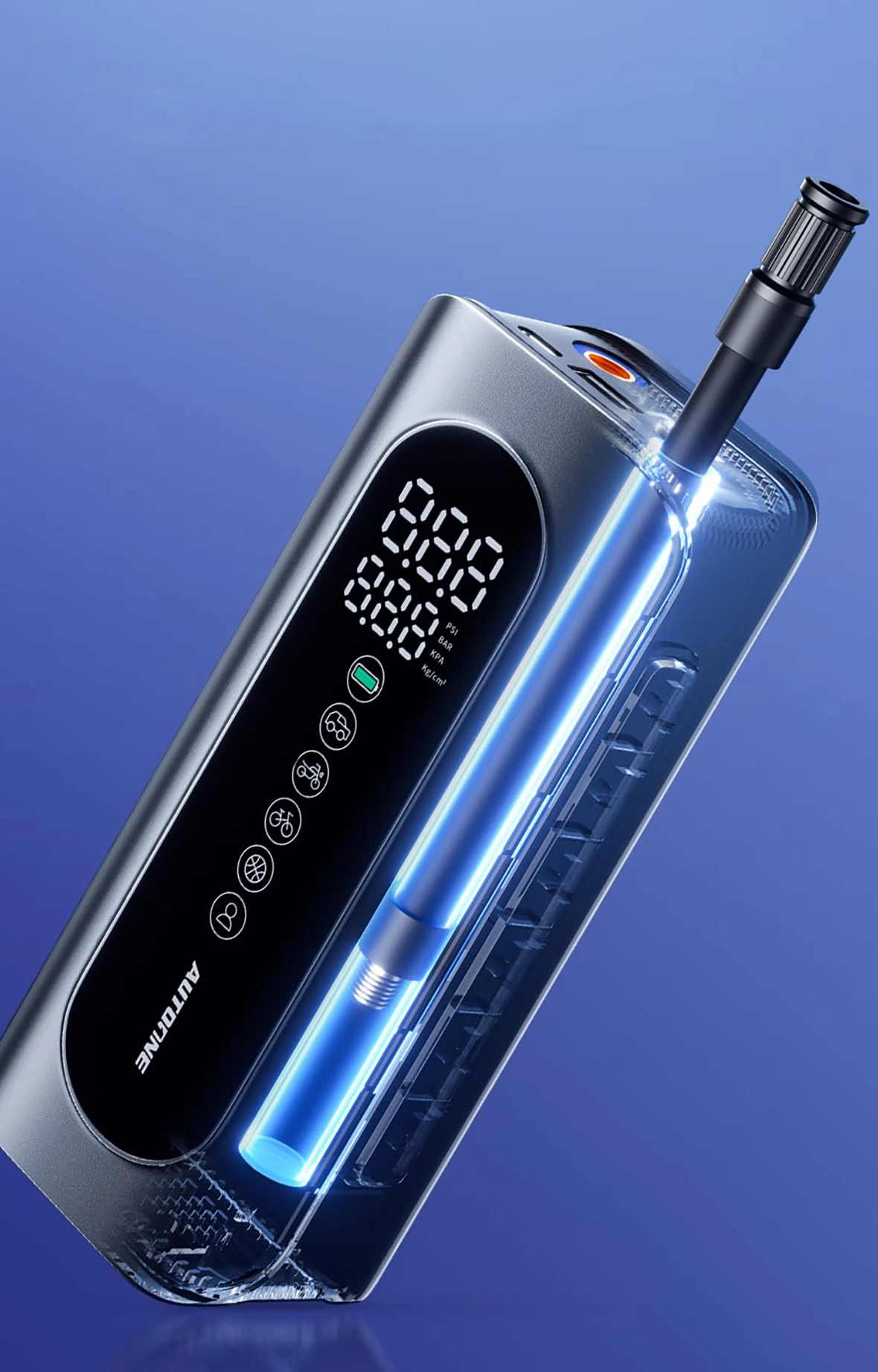 Fast cordless air pump with gauge for cars, bikes, and more.