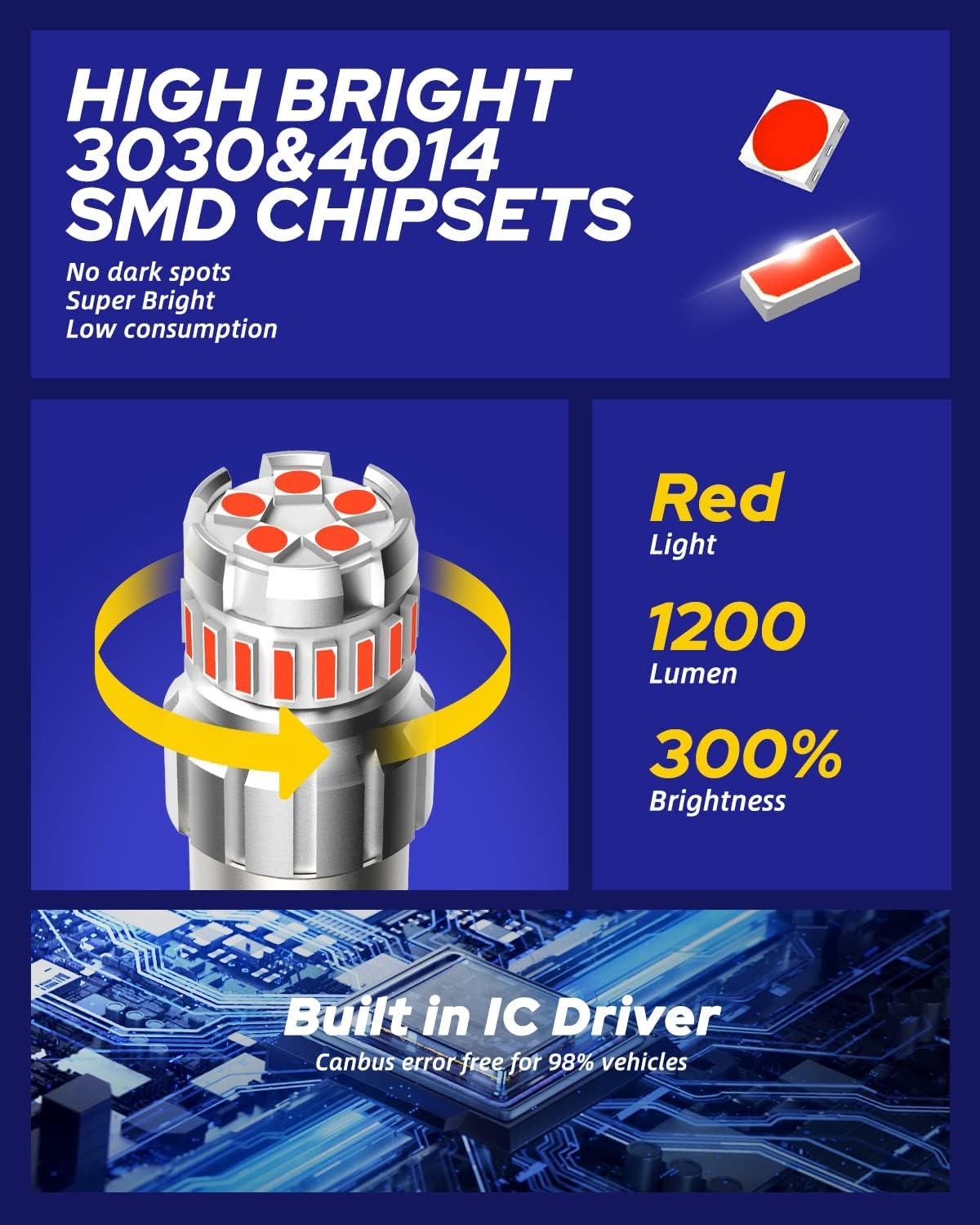 CANBUS READY: Built-in intelligent IC driver, these 7506 led bulbs are error free for 98% of vehicles. Non-polarity, simply plug and play for BA15S 1156 7506 1003 1141 P21W, etc. Used for upgrade led backup reverse lights, led tail lights, led brake light, etc.
