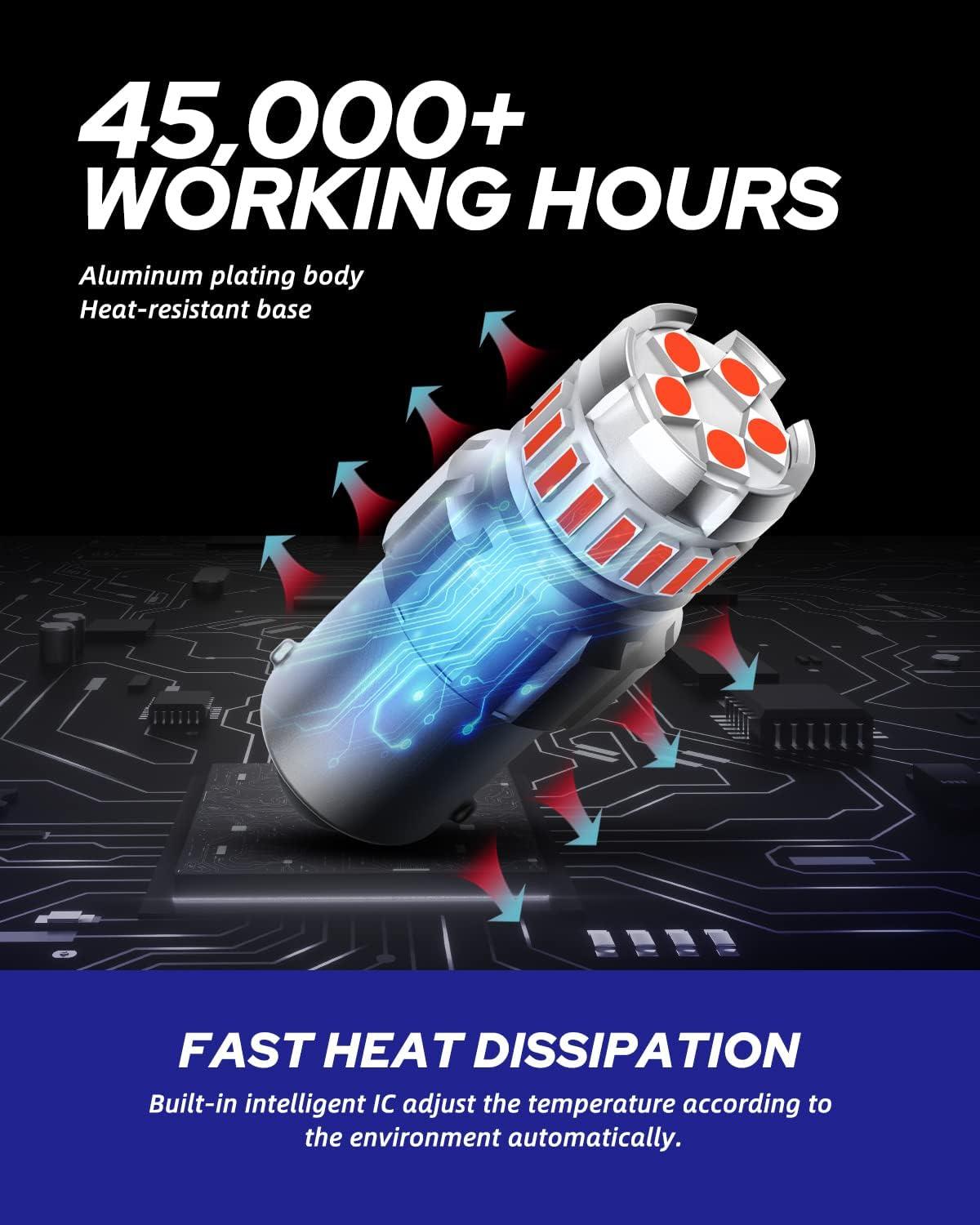 EFFICIENT HEAT DISSIPATION: Aircraft grade aluminum body built and unique bump appearance design increase the heat dissipation area. Stable performance and longevity, AUTOONE 1156 led bulbs' lifespan can be up to 45,000 hours.