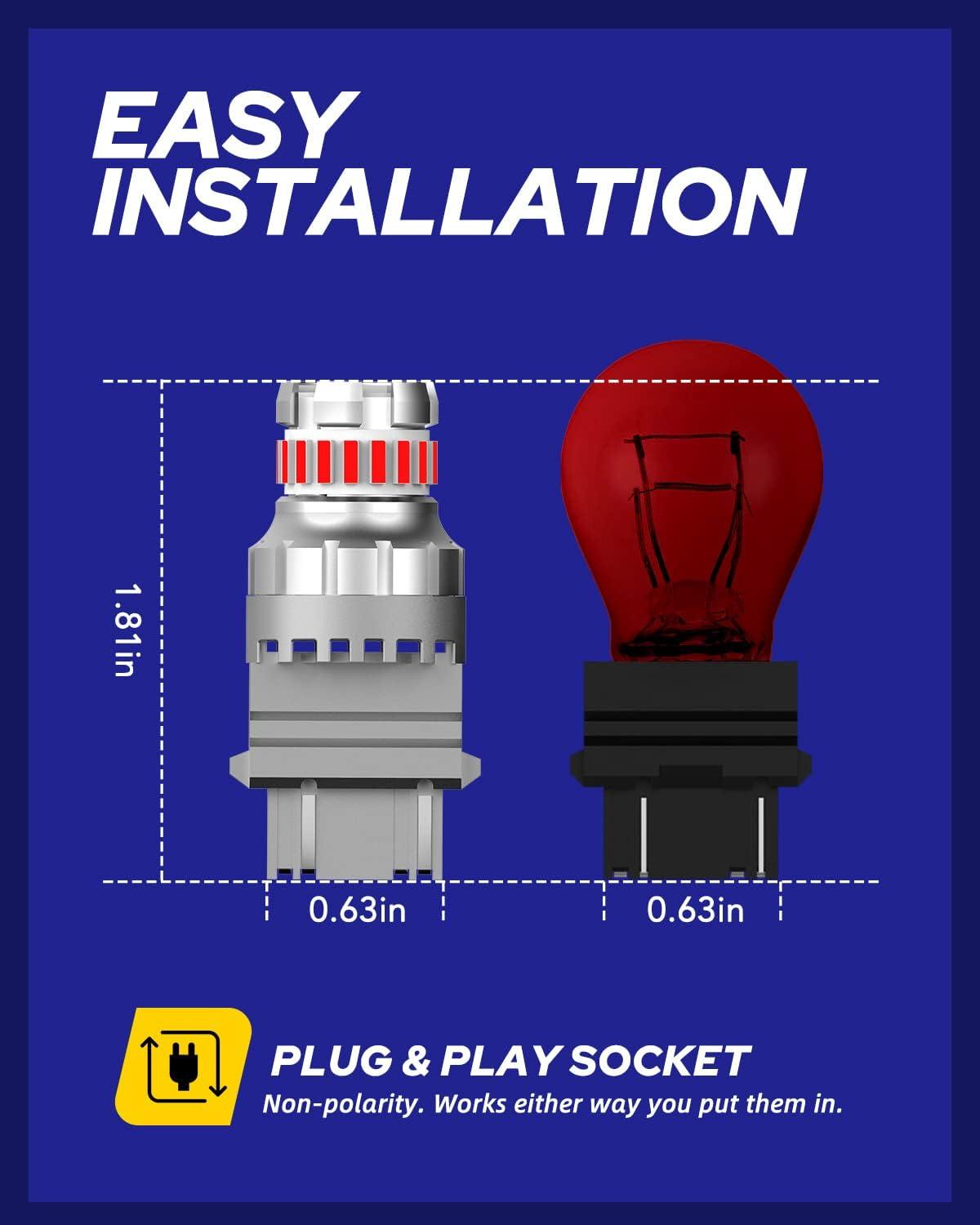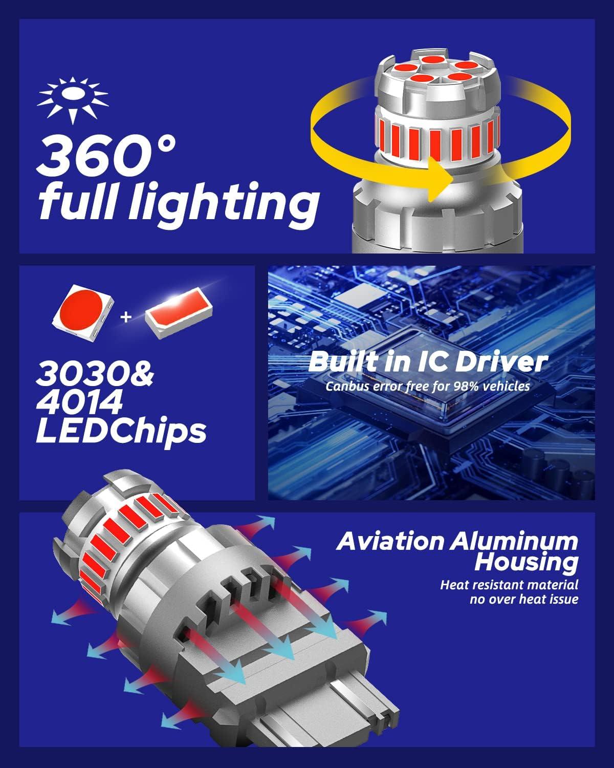ULTRA BRIGHT: AUTOONE 3157 red led bulbs utilize newest powerful and high quality 4014 & 3030SMD led chips, 360°illumination, generating 300% brighter output than halogen. Ensure sufficient illumination brightness and distance, the warning effect is more obvious.