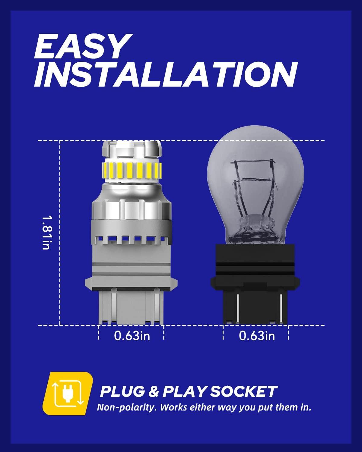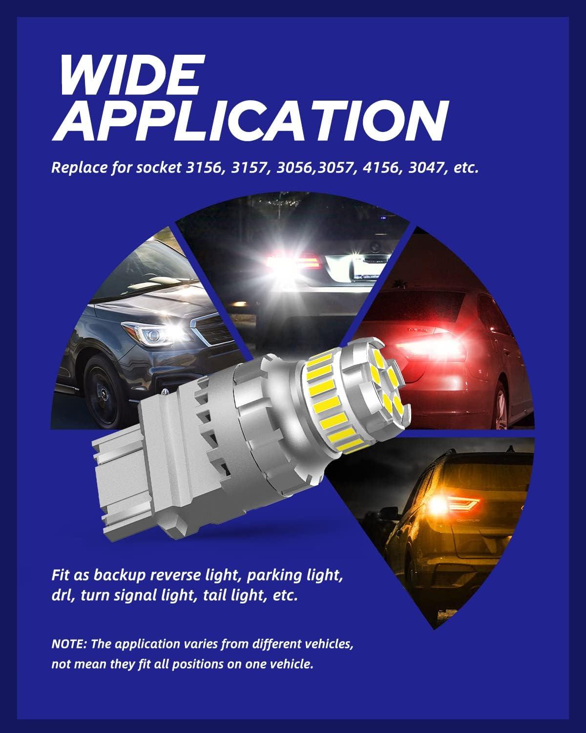 WIDE APPLICATION: Can be used for upgrading brake lights, tail lights etc. Fits T25 wedge base, Cross reference number: 3056, 3156, 3047, 3047LL, 3047K, 3057, 3057ST, 3057K, 3057KX, 3057X, 3057KLCP, 3057LL, 3155, 3155LL, 3157, 3157K, 3157X, 3157LL, 3157ST, 3157KX, 3357, 3357LL, 3357K, 3457, 3457K, 4057, 4057LL, 4057K, 4114, 4114LL, 4114K, 4157, 4157LL, 4157K, 3157-CK, 3157-SRCK, 3157-SCK, P27W/7W, 3157/40610, 3157/17172, GM 12450004, 78633, 17945, etc.