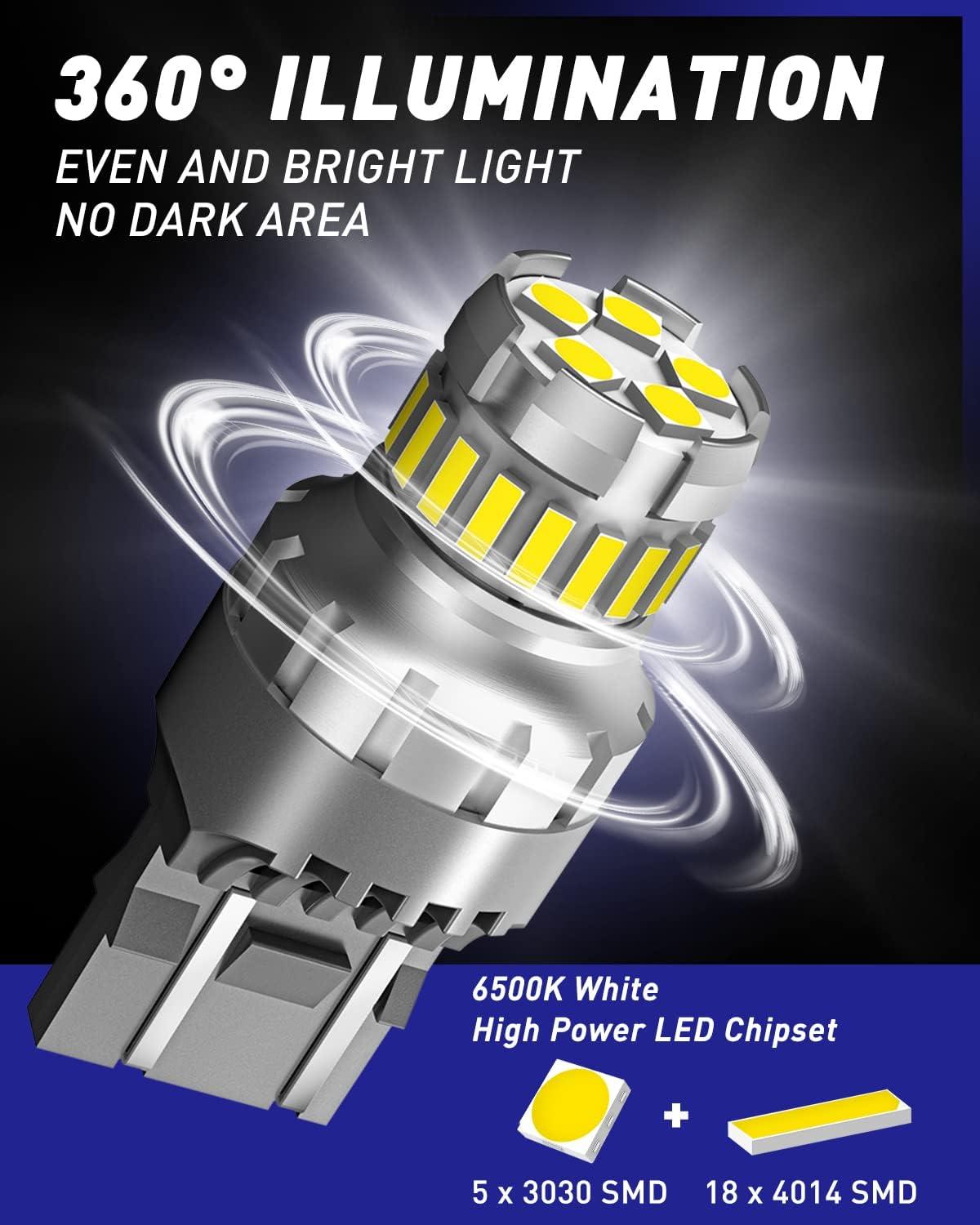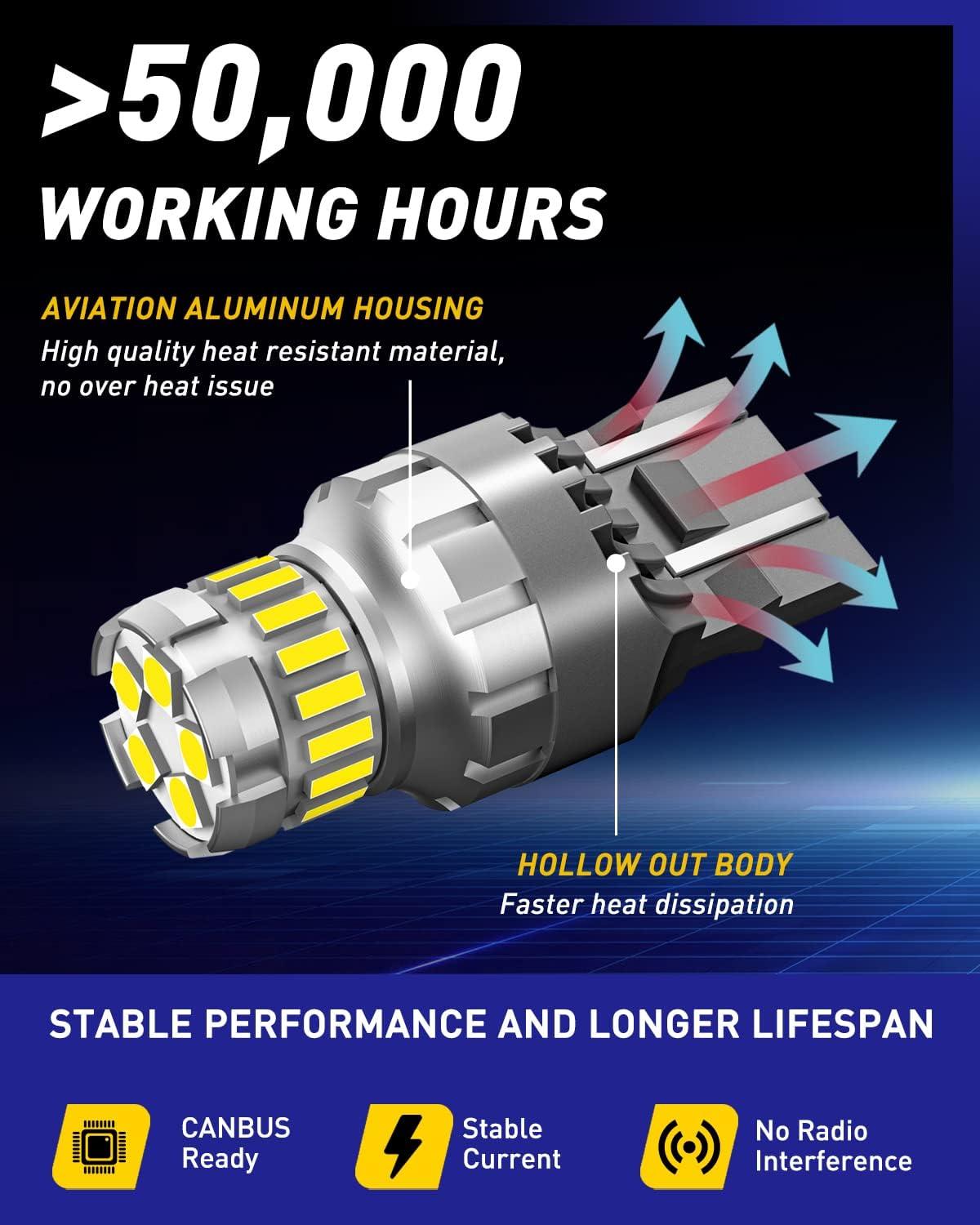【Longer Lasting】- Low power consumption & Built-in intelligent IC driver for longer lifespan. Full aviation aluminum material with hollow design for better heat dissipation and safer working. The service time of the T20 W21W LED bulb could last up to 50,000 hours.