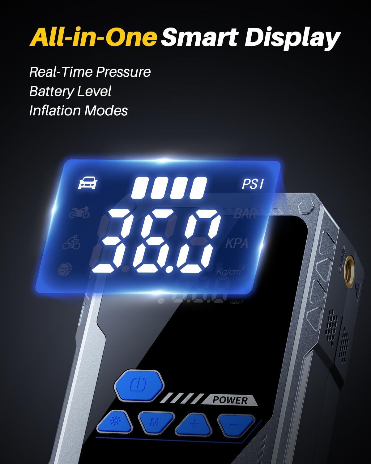 【High-Performance Air Compressor】Integrated with a high-performance air compressor, this jump box for car battery inflates tires for cars, motorcycles, bicycles, and more at 45 liters per minute. It quickly boosts tire pressure, such as inflating a pickup truck tire from 30PSI to 36PSI in just 2.5 minutes, ensuring optimal tire performance on the go. This versatile car jump starter with air compressor meets all your inflation needs.