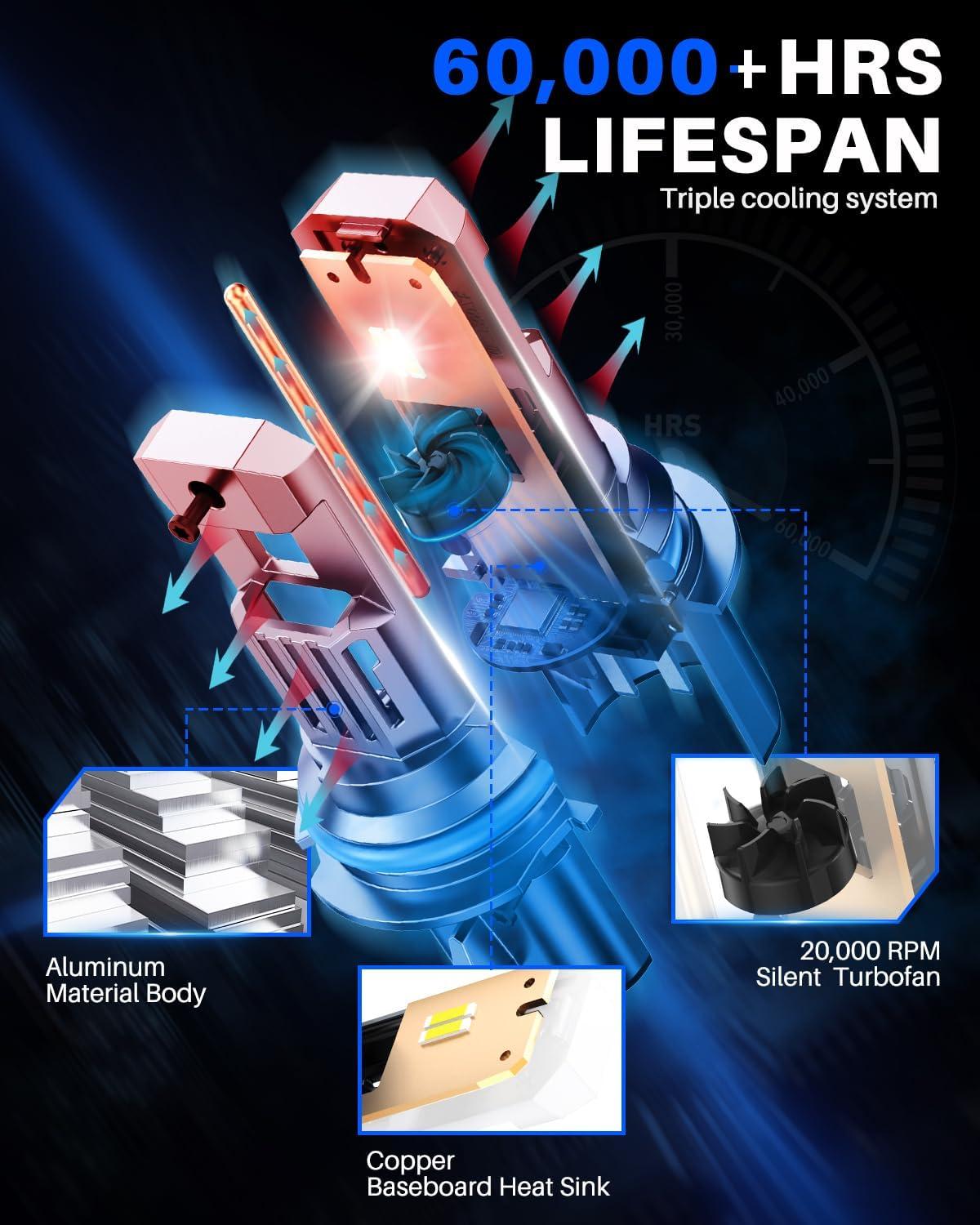 【Over 60,000 Hours Lifespan】Constructed with aviation-grade aluminum and featuring an advanced cooling system with a hollow-carved heat sink and silent turbofan, these bulbs are built for longevity. They boast a lifespan exceeding 60,000 hours, providing reliable performance for years