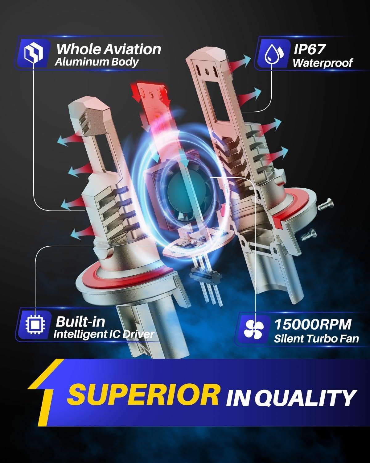 【Plug and Play】H1 Light Bulb is the 1:1 size same as halogen bulb. Wireless design, no external driver, no additional adapters needed, installation in less than 10 minutes. The non-polarized design and compact structure eliminate the need for oversized bases or additional drivers, making installation quick and hassle-free.