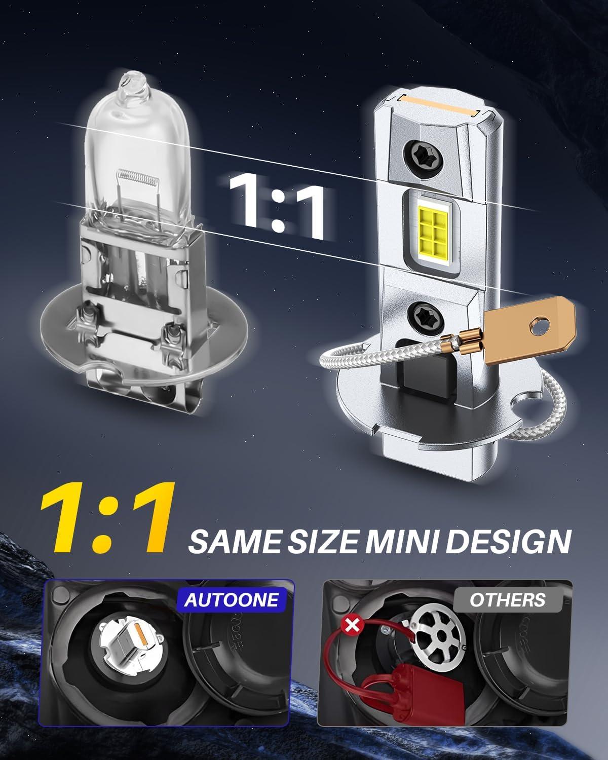 AUTOONE H1 LED Light Bulb, 400% Super Brighter 1:1 Halogen Size, 6500K White Fog Bulbs, Plug and Play, Pack of 2(H3)