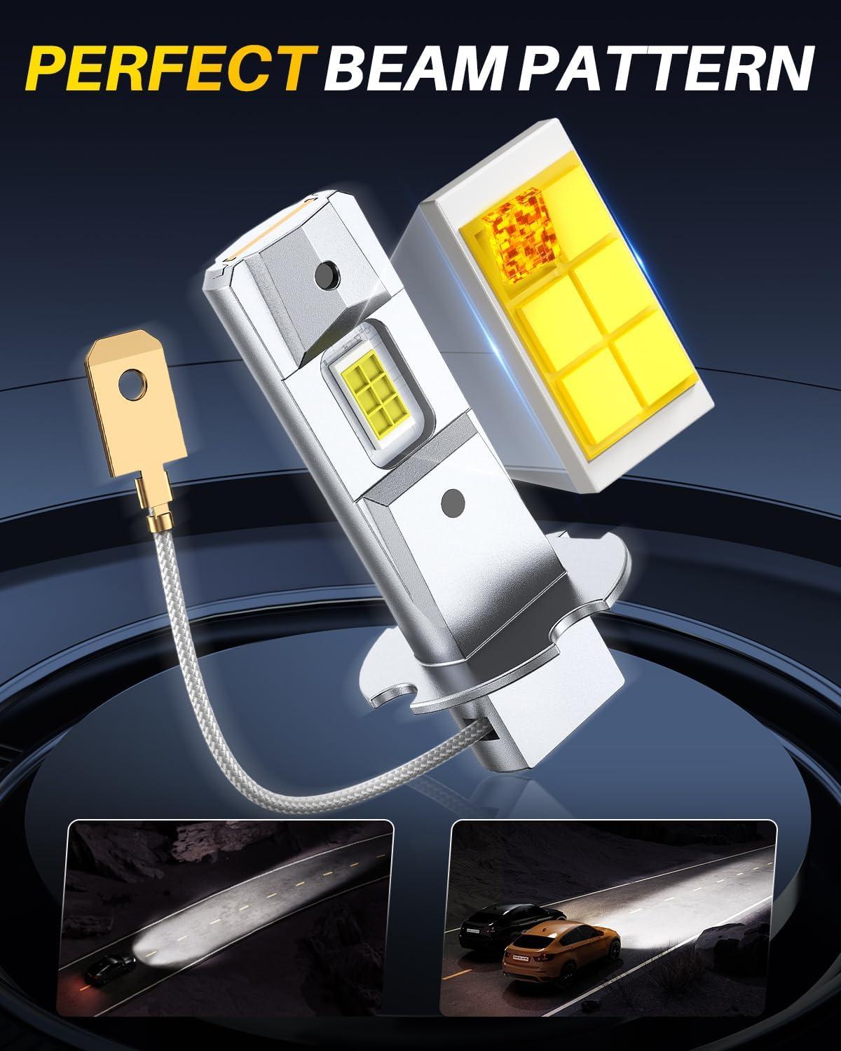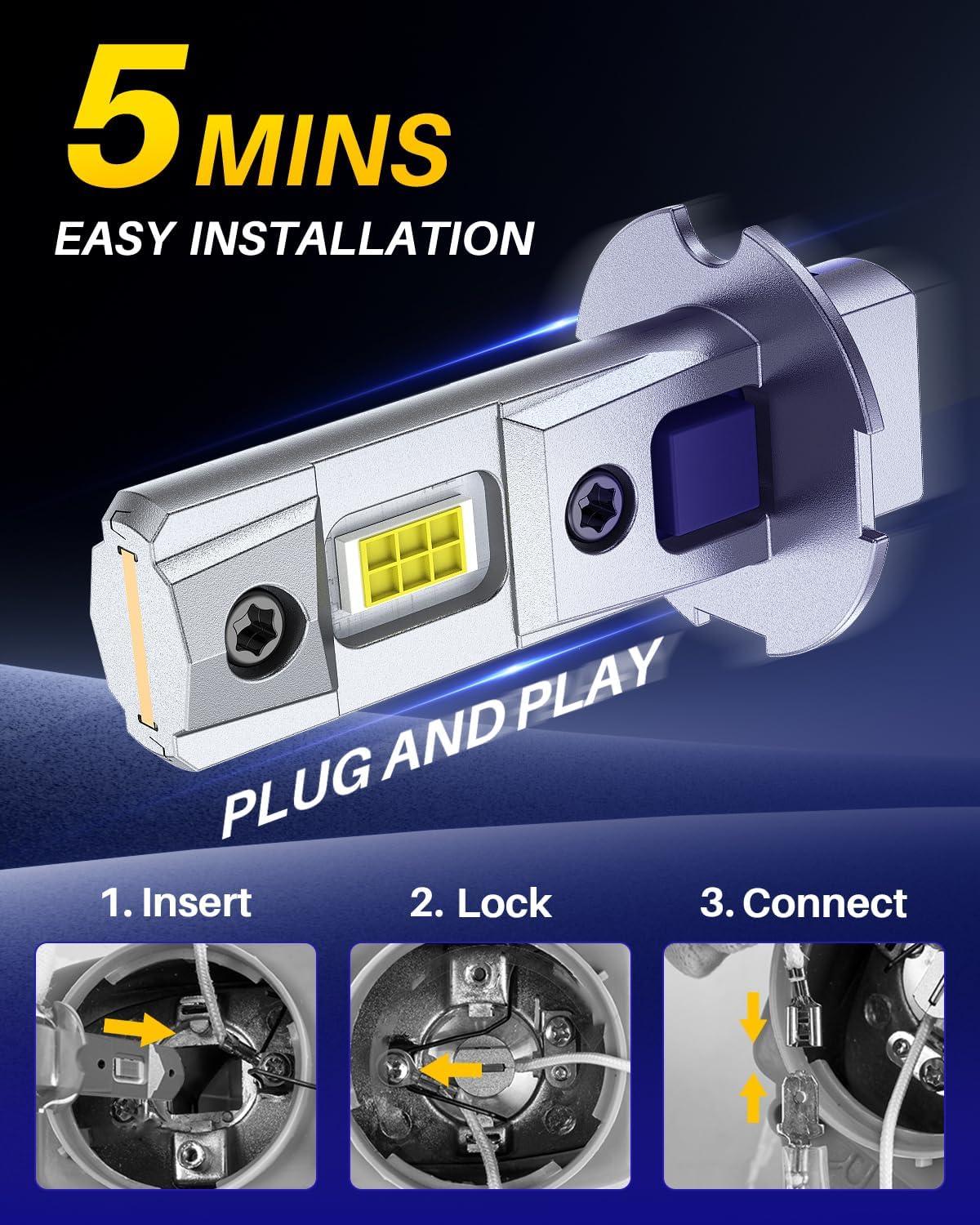 【Plug and Play】H1 Light Bulb is the 1:1 size same as halogen bulb. Wireless design, no external driver, no additional adapters needed, installation in less than 10 minutes. The non-polarized design and compact structure eliminate the need for oversized bases or additional drivers, making installation quick and hassle-free.