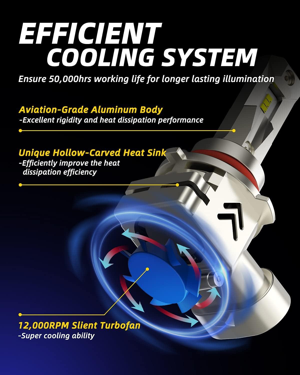 Durable 60000h Life: The design of the radiator plus the supercooling capacity provided by the 15,000RPM turbo cooling fan. Cool down quickly when working hence no overheat for the h11/h9 hb3/9005 led light. Which ensure its lifespan more than 6 years