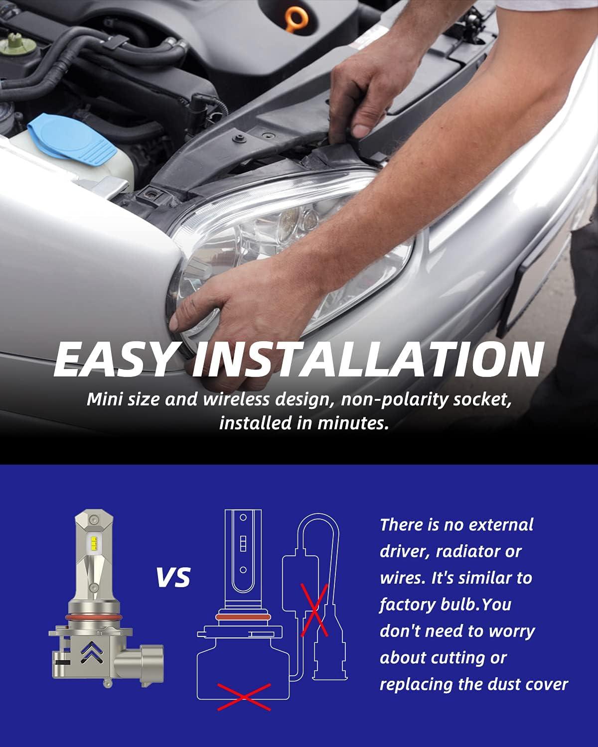 Plug-n-Play: Compact size with halogen's 1:1 design, same base height and overall length for autoone led h11 9005 bulbs. Without additional drivers and wiring harness, directly Insert and clockwise to lock, hassle-free intall even you are a novice