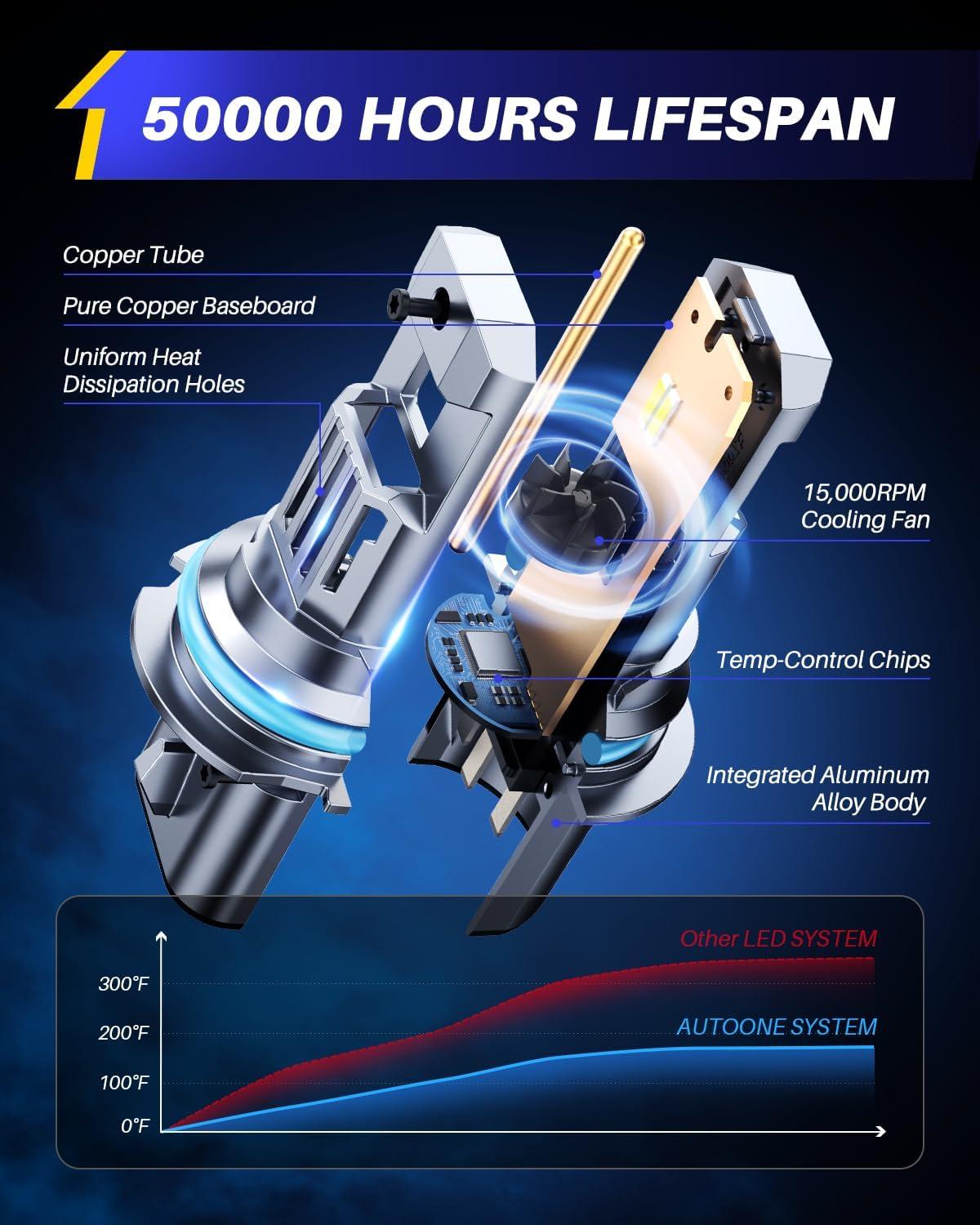 More than 50,000Hr Longer Lifespan: AUTOONE h11 light bulbs use less power than halogen bulbs which means produce less heat. With whole aluminum body and temperature control element, the h9 h8 l ed will operate in a normal working temp range and produce continuous lighting without damage shortly