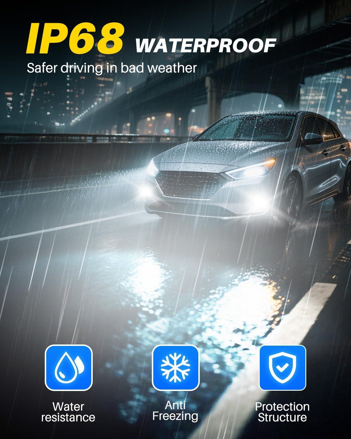 【Over 50,000+ Hrs Lifespan】 Constructed with aviation-grade aluminum and a hollow heat sink design, the H11 H9 led fog lamp effectively dissipates heat, maximizing H11 fog lights’ lifespan. With an IP68 waterproof rating, can keep out water and dirt. It delivers reliable performance in harsh weather