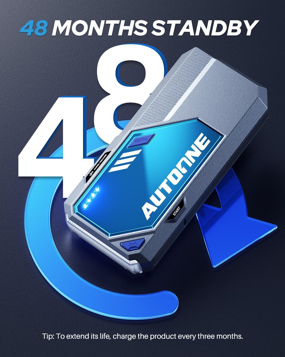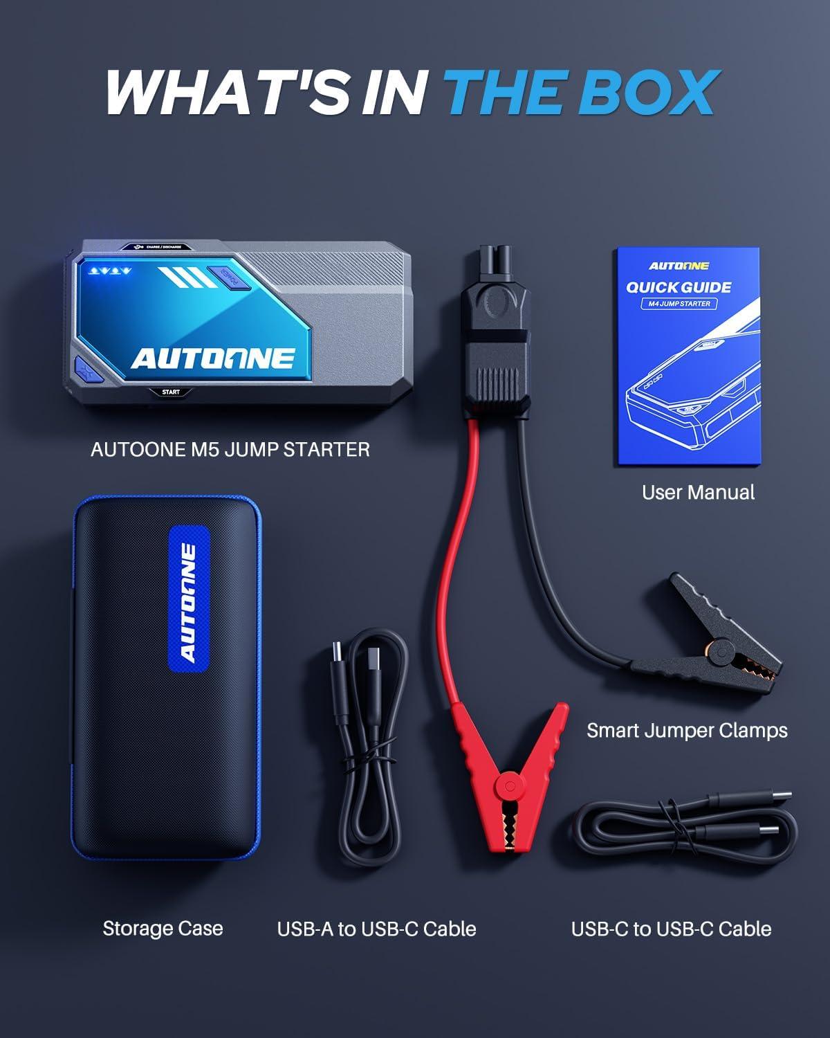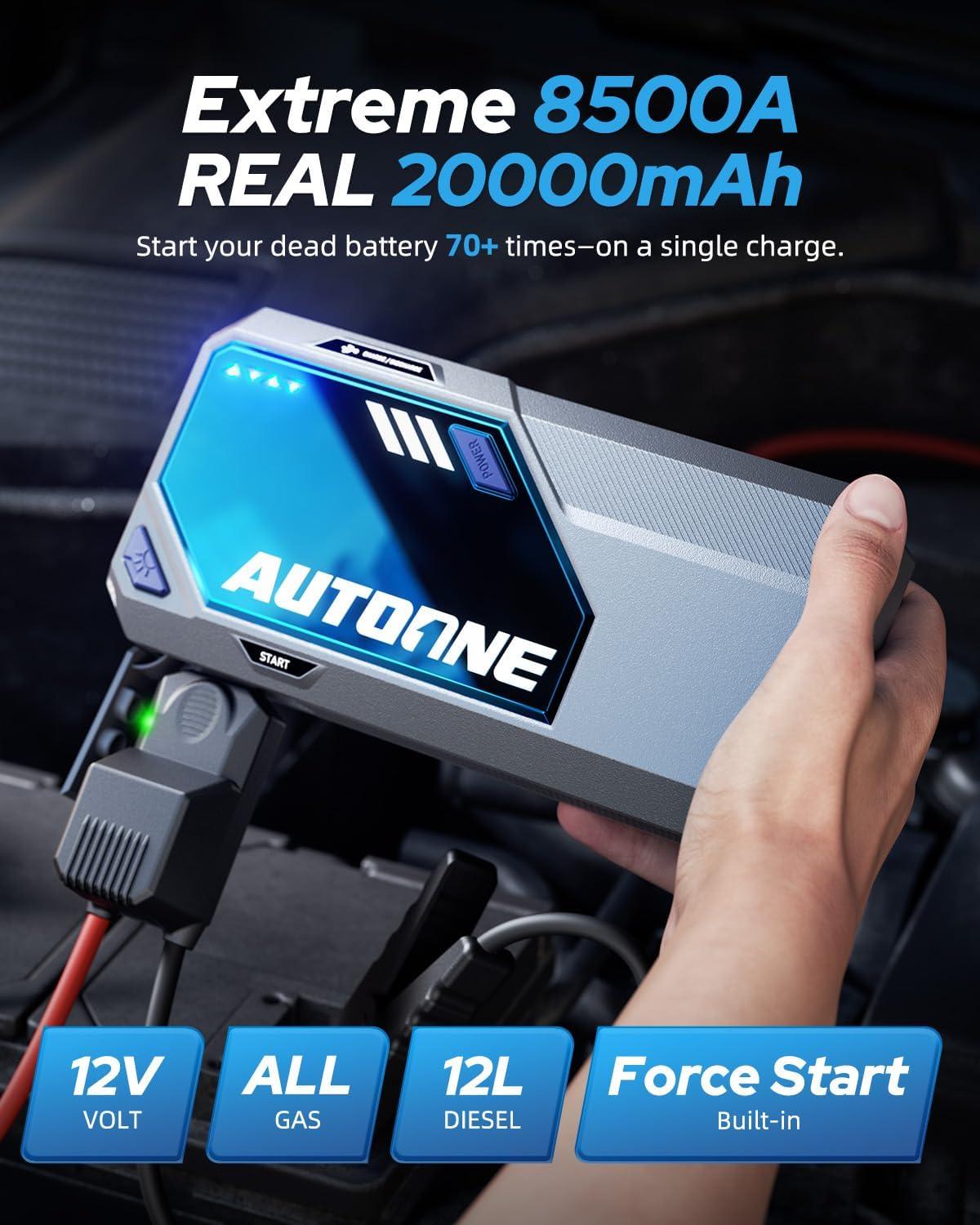 True 20,000 mAh & 8500A Peak – Real numbers. Real power. Built with a 20,000mAh capacity and 8,500A peak current, the AUTOONE M5 car jump starter Battery easily cranks up to All Gas & All Diesel engines. Ready to start anything, anytime.