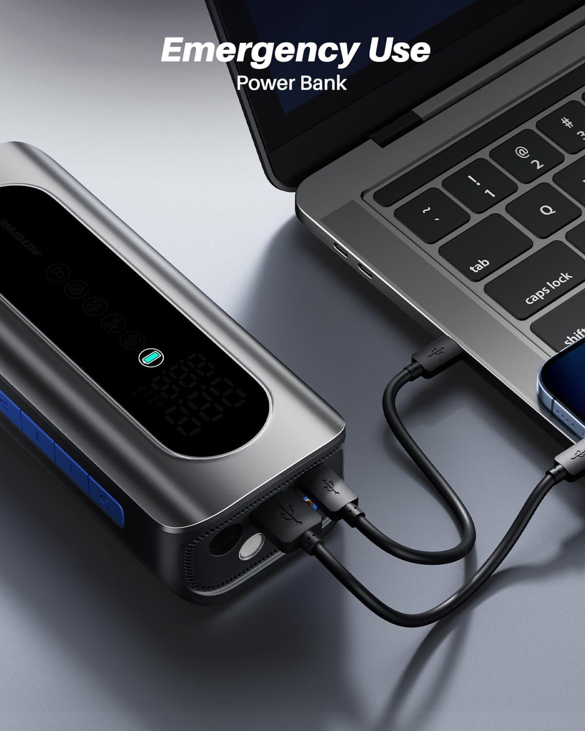 MULTI-FUNCTIONAL EMERGENCY: The portable tire pump can be used as more than an air pump, it is also emergency lighting flashlight — 3 modes (flashlight, strobe, and SOS). The air compressor is equipped with Type-C and USB input/output ports, providing backup power for your phones and other electronic devices.