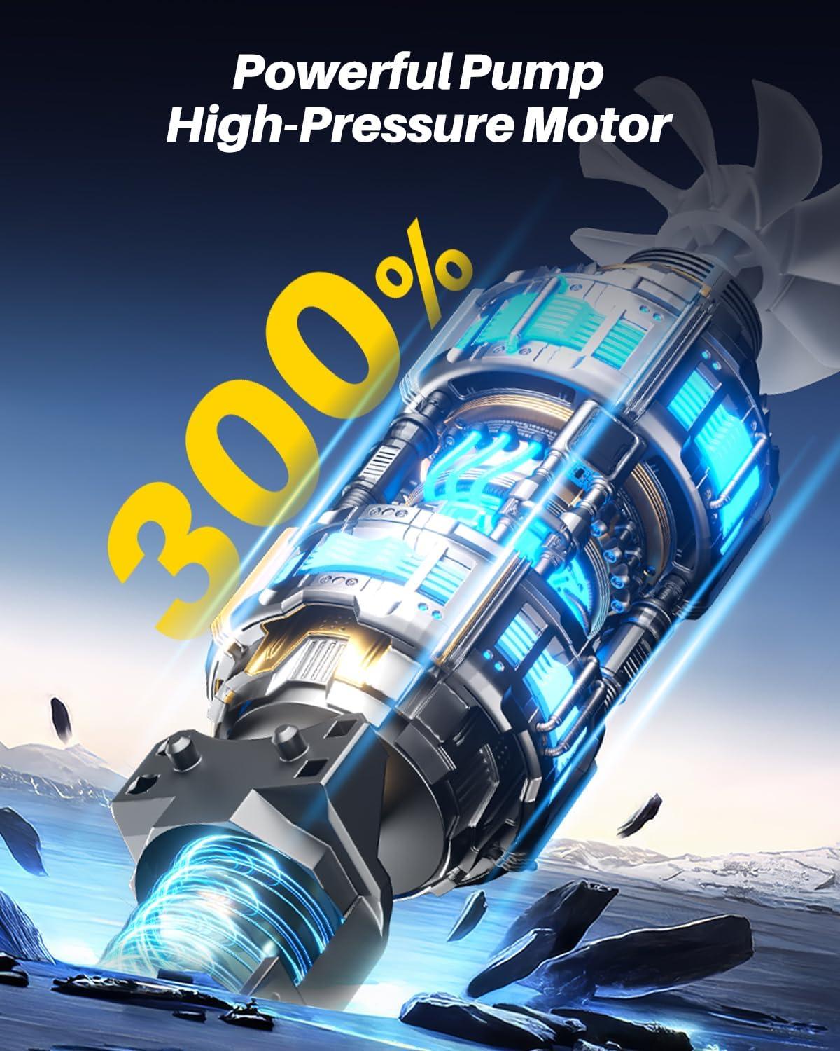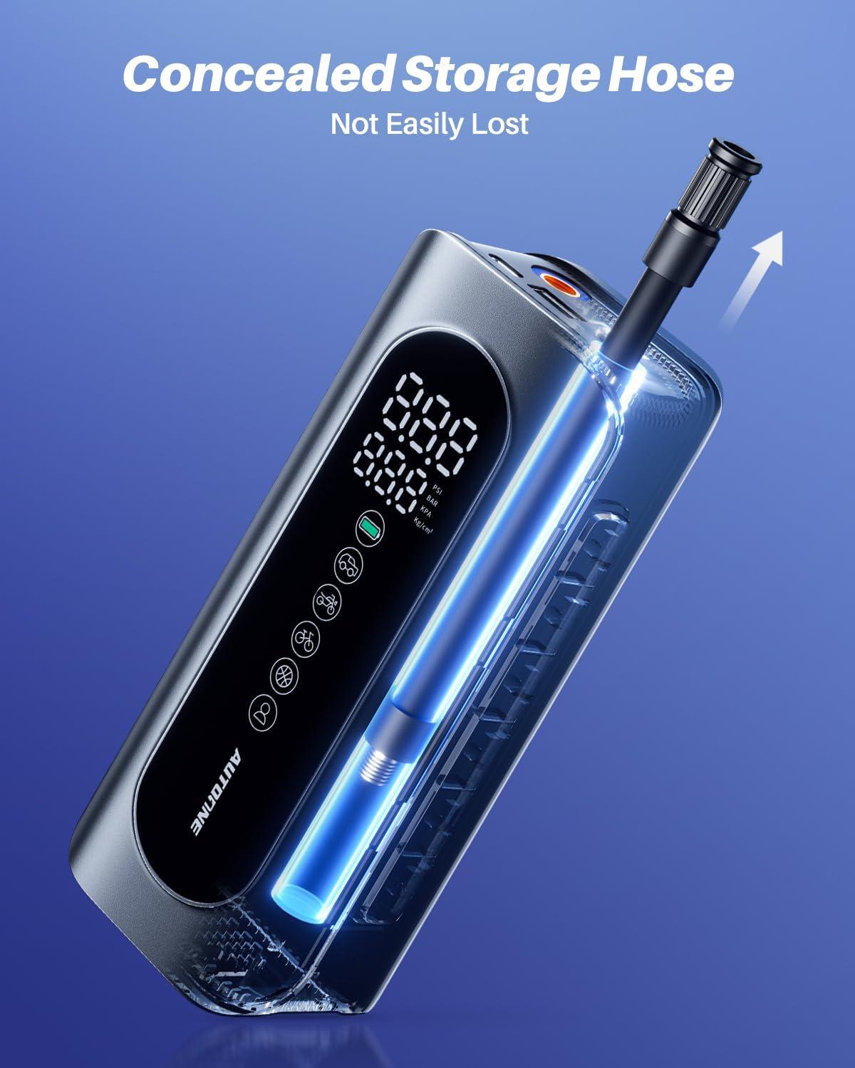 PORTABLE TIRE INFLATOR: Concealed storage tube, ultimate portable design. Compact and lightweight, it easily fits into a backpack, car trunk, or even a motorcycle's storage compartment. Whether you're on a road trip, cycling adventure or daily commute, you can carry it with you without any burden and inflate your tires anytime, anywhere.