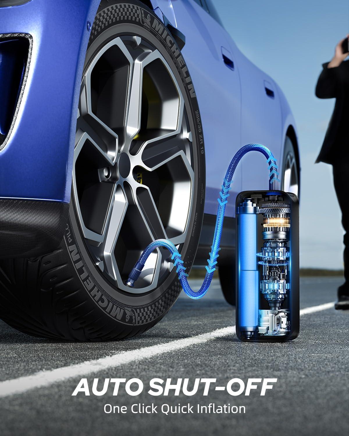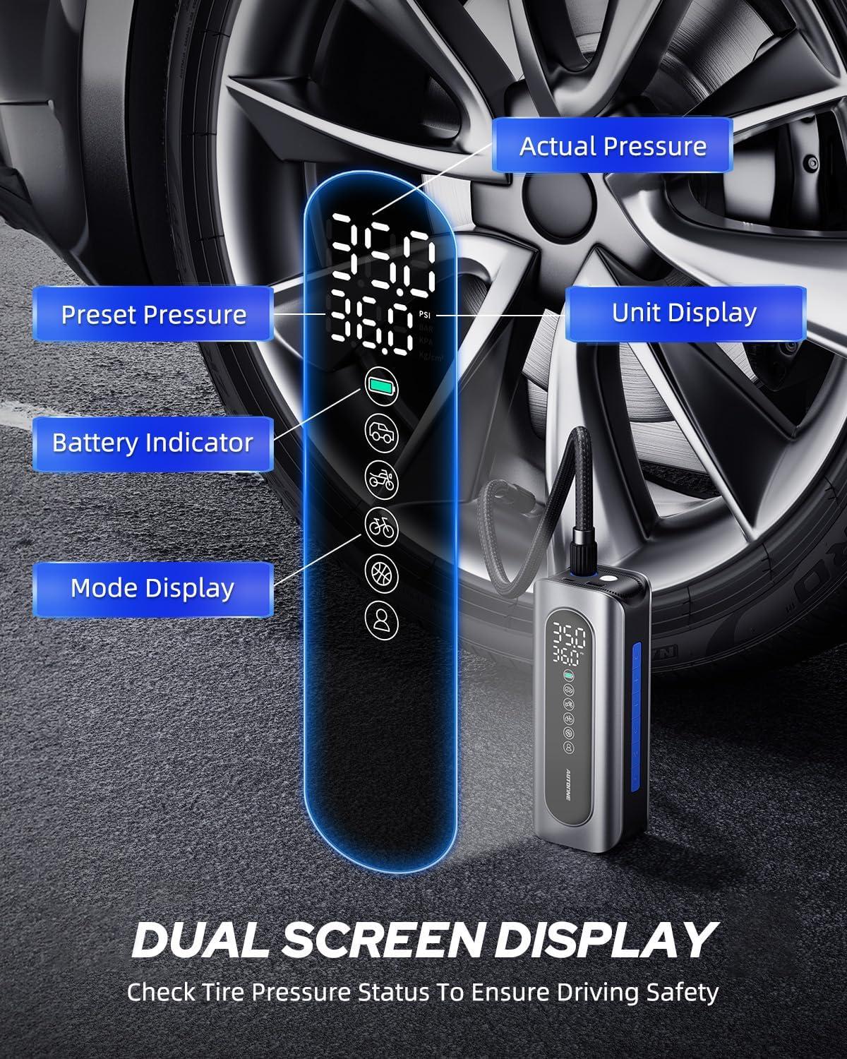 Jet-inflate: AUTOONE Upgrade tire pump needs only 40s to refill a compact SUV tire ( from 29 to 36 PSI); Universal pressure of 2-150 PSI. Being faster and highly accurate, optimized for compact cars, motorcycles, SUVs, bicycles, balls, and other inflatables