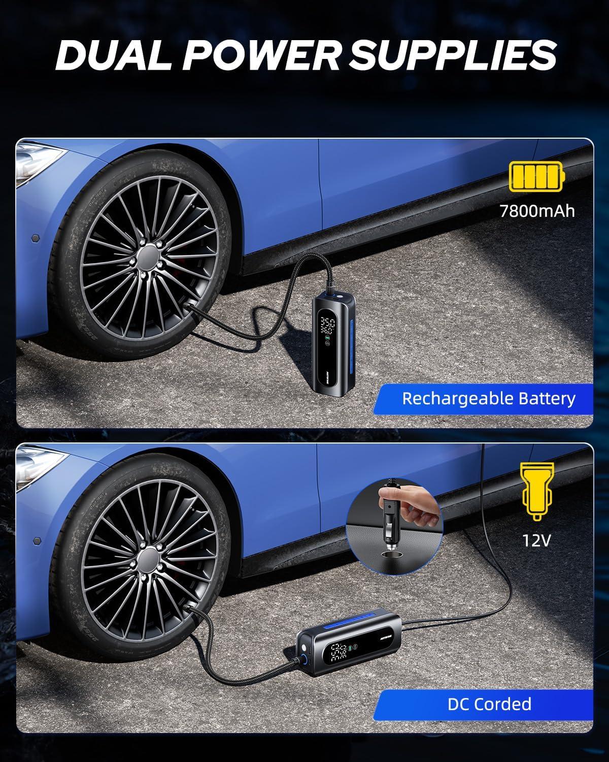 Convenience to Inflate from Any Angle: Portable tire inflator built in 7800mAh powerful rechargeable battery with an 19.7 inch upgraded anti-scalding and high-pressure hose for cordless convenience. What’s more, 12V car power adapter is also available(11.5 FT long wire to cover whole car), providing uninterrupted inflation at any time